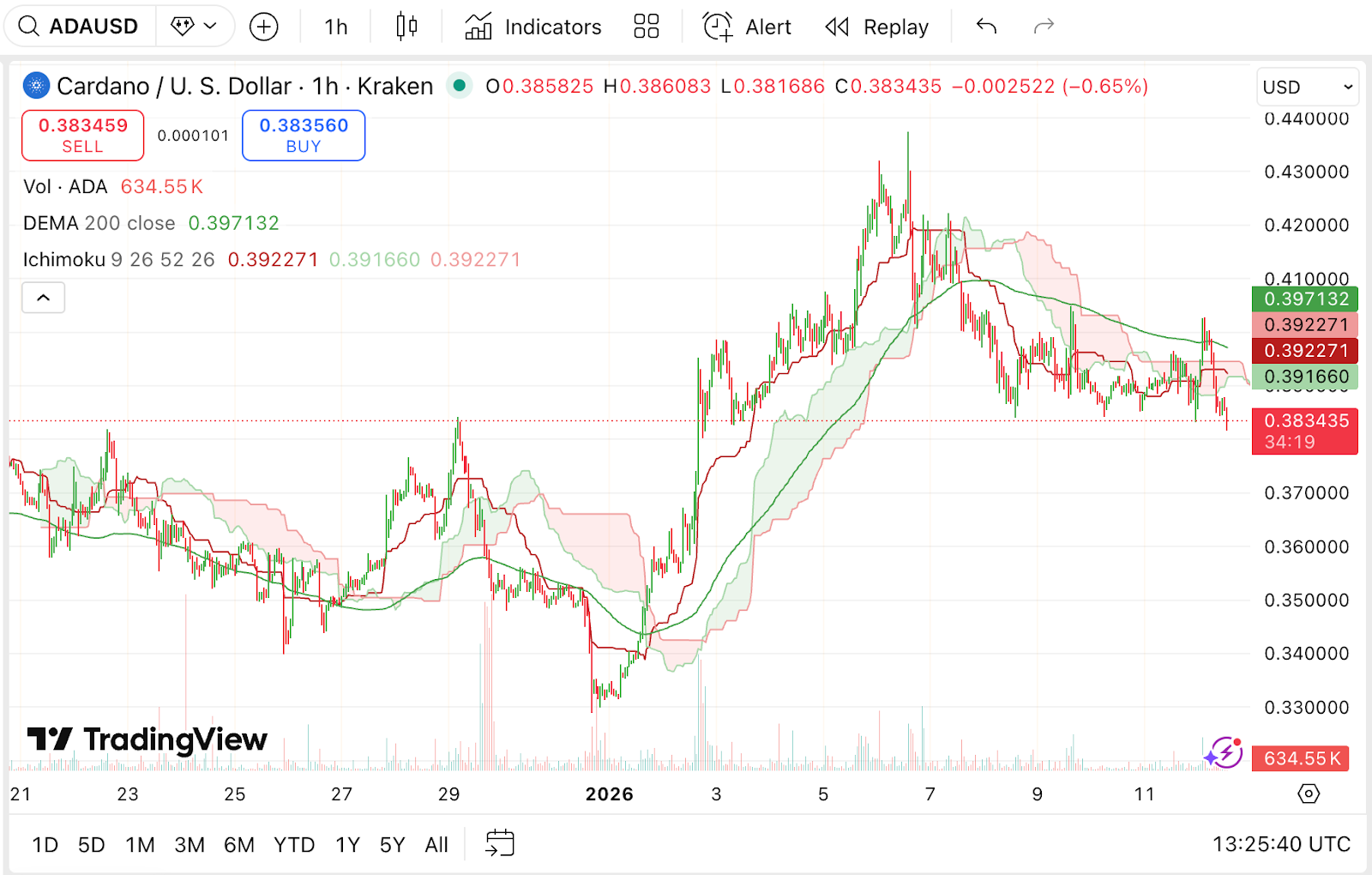 Harga Cardano saat ini diperdagangkan pada $0,3840, turun 2,74% pada hari itu, menempatkan sentimen pasar jangka pendek di bawah tekanan. Kapitalisasi pasarnya berada di $13,81 miliar, sementara volume perdagangan telah melonjak menjadi $560,06 juta, naik lebih dari 115%. Lonjakan volume ini menyoroti reposisi aktif oleh investor kripto daripada pelemahan harga sederhana.