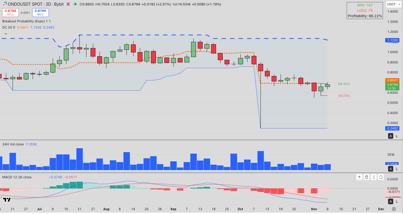 Ondo Finance (ONDO/USDT) price is stabilizing near $0.68, up nearly 3% intraday, following a multi-week downtrend that bottomed at $0.24. The Donchian Channel resistance lies at $1.12, while immediate support rests around $0.25. Current Ondo price action shows a mild bullish divergence between price and MACD momentum, hinting at a potential bullish reversal ahead.