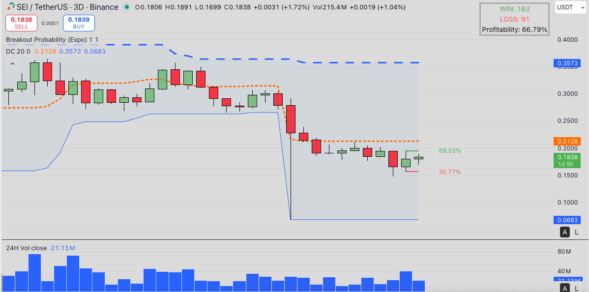Sei price action on the 3-day Binance chart shows consolidation above the $0.18 level following a 25% recovery from October lows. The Donchian Channel mid-band resistance at $0.2128 marks a key inflection point, while upper resistance sits near $0.3573.