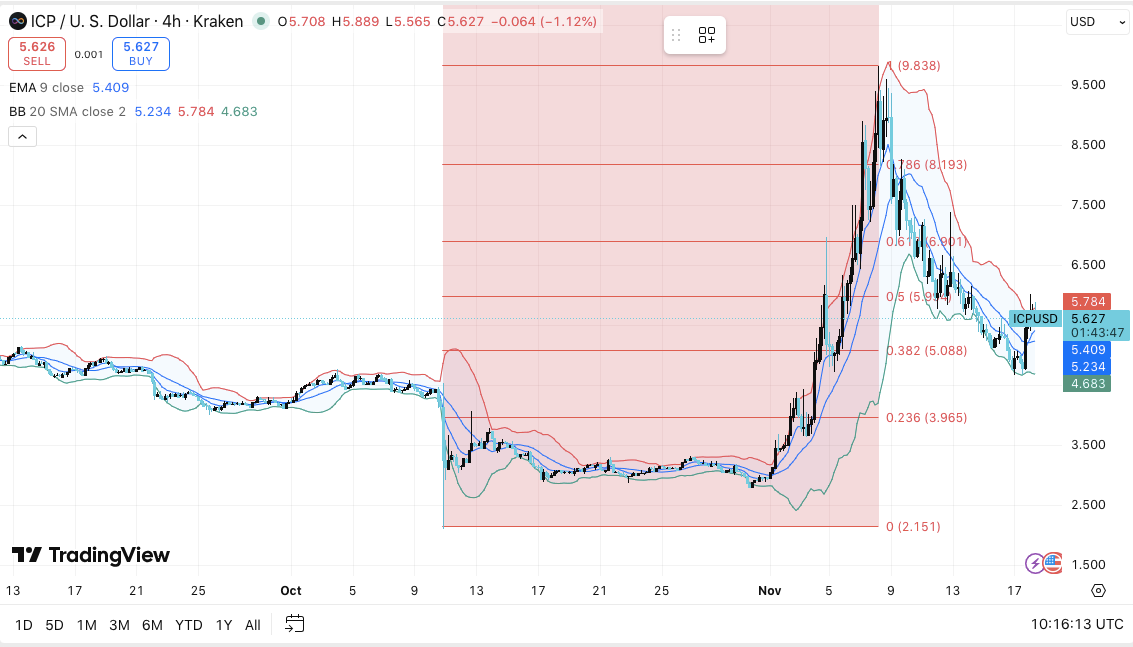 ICP currently trades around the $5 region after rejecting the recent $9.83 swing high. Price has slipped through multiple retracement levels and now sits near the 0.382 Fib at $5.08. This zone acts as the first meaningful support after the breakdown from $6. Sellers continue to control the short-term structure, as price still trades under the EMA-9 at $5.40.