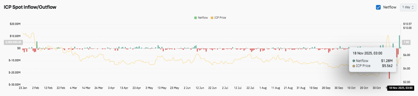 However, inflows have improved recently. ICP recorded a $1.28 million positive netflow on November 18 near the $5.56 level. This marks one of the largest accumulation phases in weeks.