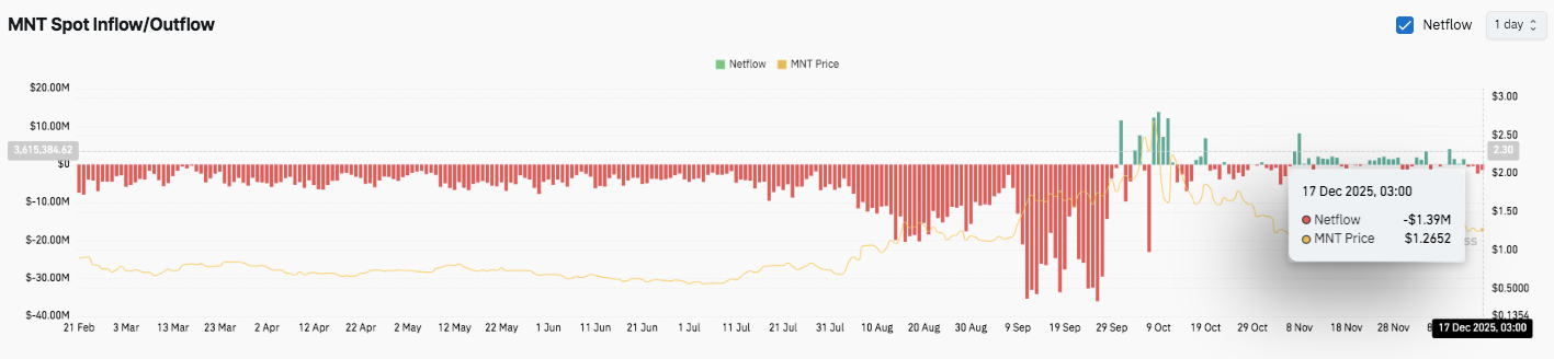 Despite this outflow, MNT price stabilizes near $1.2652. Consequently, sellers appear active, yet they fail to force a deeper breakdown. This pattern suggests profit-taking rather than aggressive distribution.