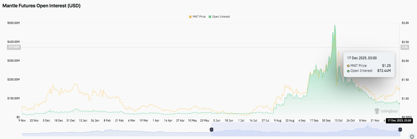 Moreover, futures market data highlights growing participation. Open interest remained muted until early May 2025. It then climbed steadily, peaking near $72.44 million in December. During the same period, MNT price surged toward $2.36 before pulling back.