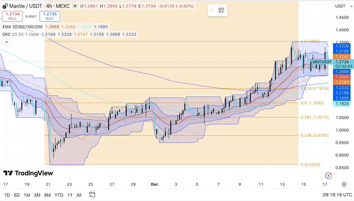 Mantle price direction hinges on whether buyers can defend the $1.23–$1.26 zone. Holding this range keeps the bullish bias intact and supports a renewed attempt at $1.33–$1.36. A clean break above $1.36 could trigger an extension toward $1.45.
