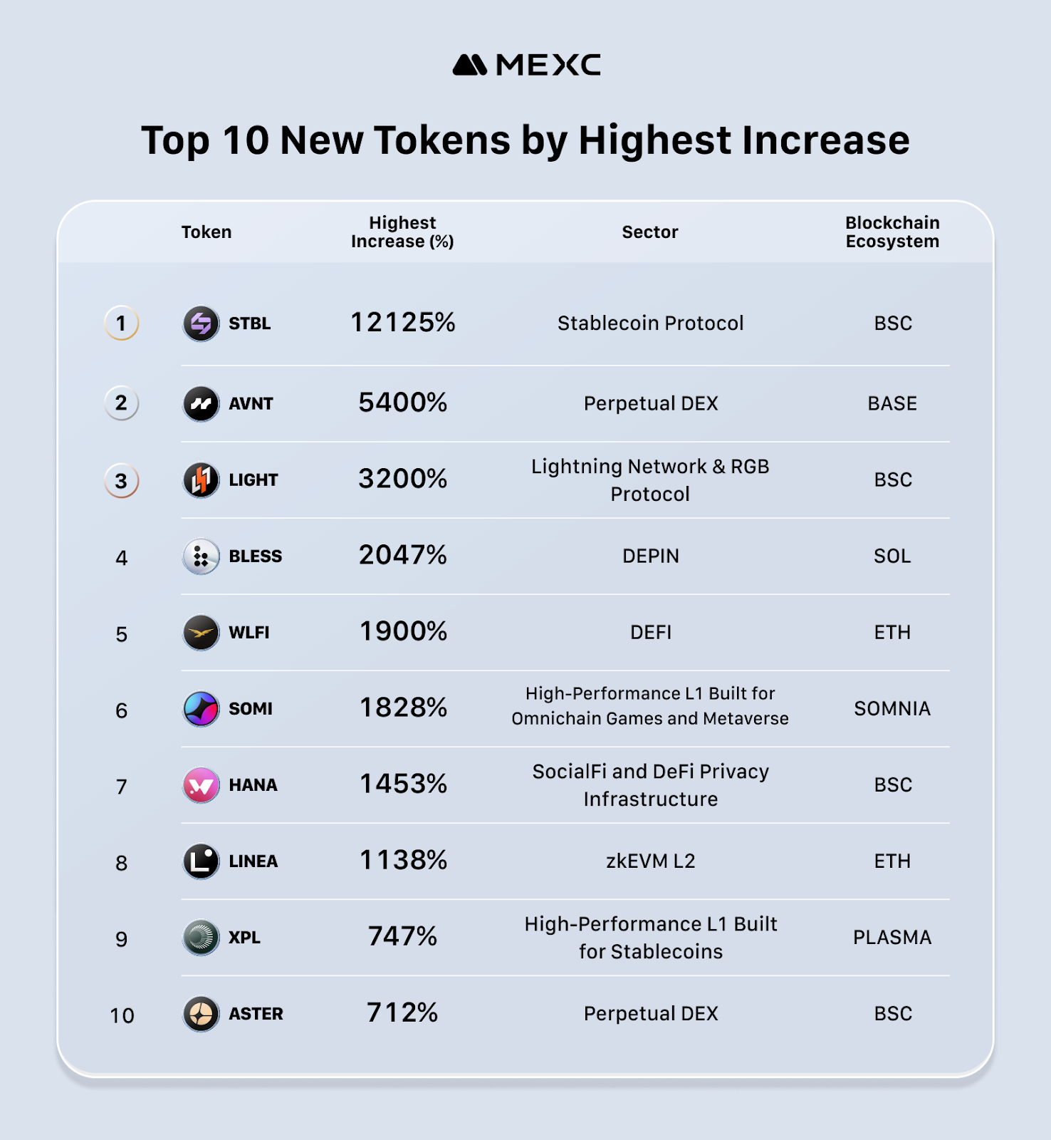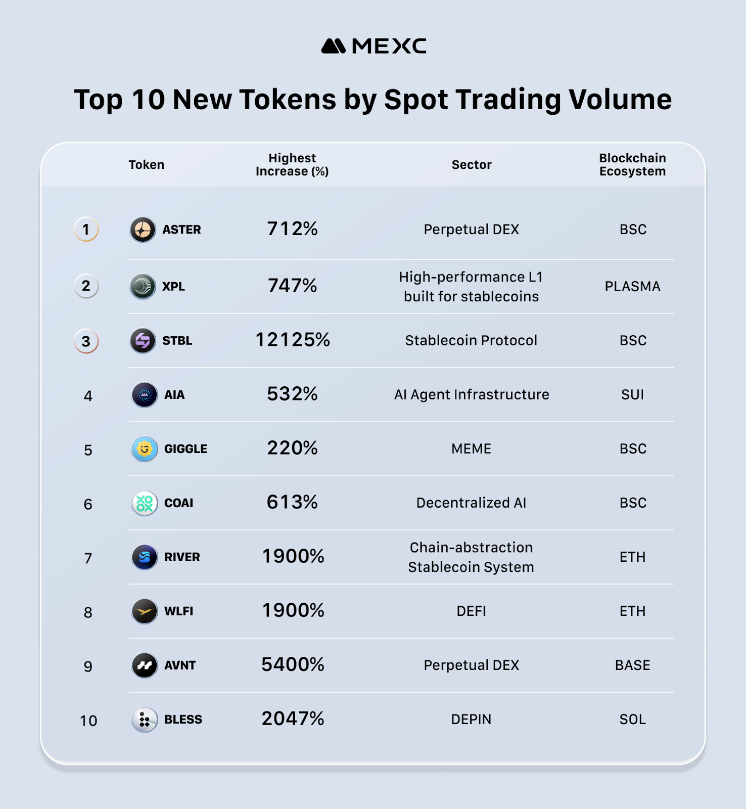 Perpetual DEX, AI, and stablecoin-linked projects led MEXC’s top-performing tokens. The top 10 tokens by spot trading volume delivered an average gain of +2,620%, up 47% from Q2. Flagship Perpetual DEX tokens such as AVNT (+5,400%) and ASTER (+712%) set the tone for the month, supported by Base and BSC chain ecosystems.