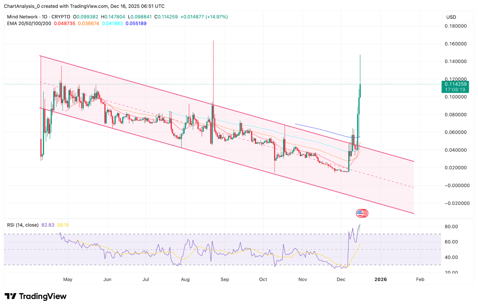 - Mind Network breaks out of a multi-month descending channel with strong volume expansion