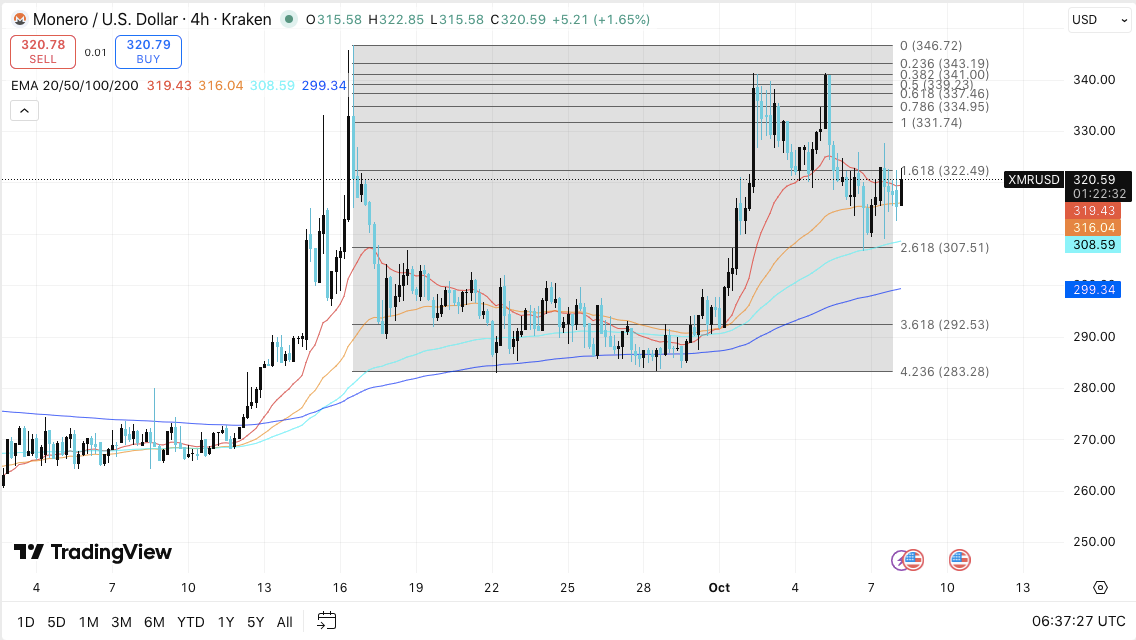 XMR price action on the 4-hour chart shows sustained support around the $300 zone. The 20-day exponential moving average (EMA) sits at $319, while the 50-day EMA rests near $316, both acting as dynamic supports.
