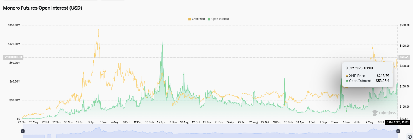 The futures open interest trend for XMR reflects fluctuating trader activity throughout 2024 and 2025. Open interest peaked near $120 million in early 2025, signaling strong speculative participation.