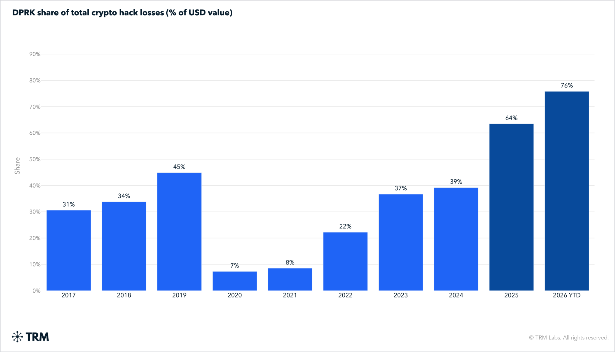 On April 30, 2026, TRM Labs reported that North Korean hacking groups accounted for 76% of all crypto hack losses through April 2026, achieving this through just two high-impact operations rather than a high volume of attacks.
