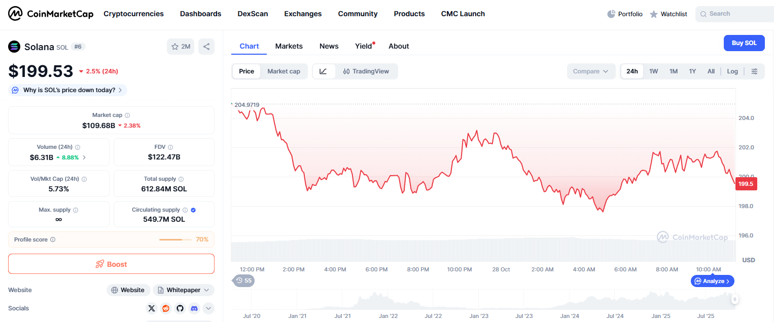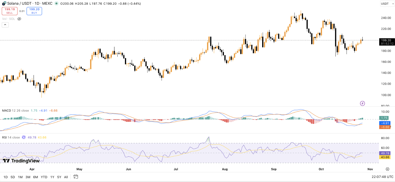 Solana’s market performance reflects this growing institutional narrative and renewed optimism. The price has climbed over 8% in the past week, pushing towards the psychologically important $200 mark and currently trading near $199.50.