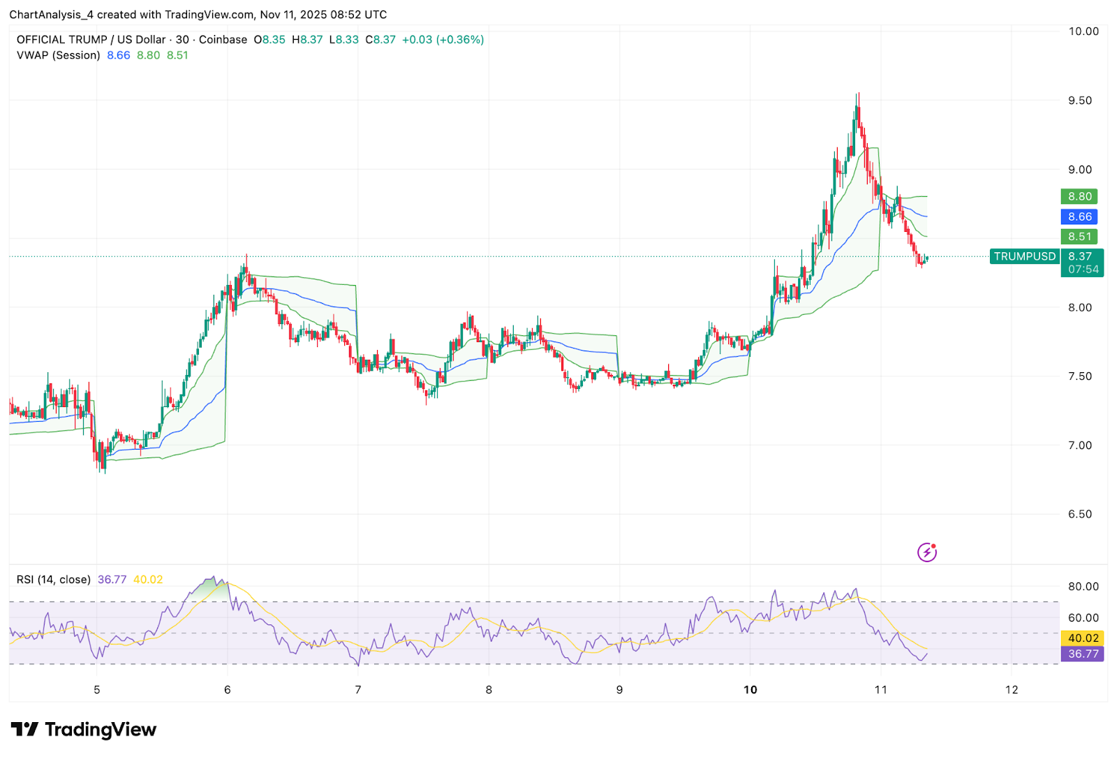 The short term playbook is straightforward. TRUMP must reclaim VWAP and close above $8.80 to indicate that demand is returning. Anything below VWAP keeps the trend tilted lower.