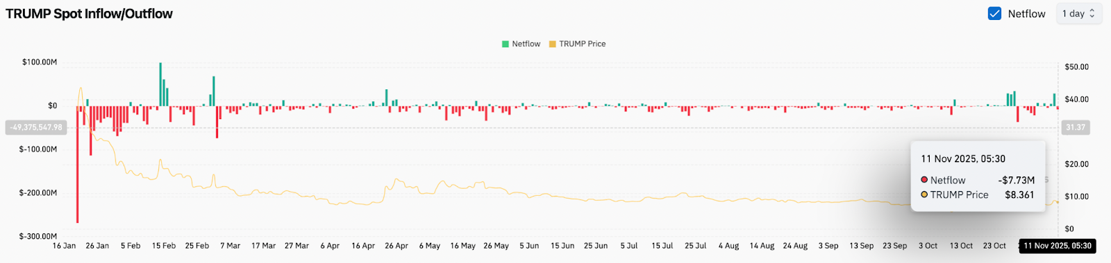 Coinglass data reveals that TRUMP recorded $7.73 million in net outflows on November 11. Outflows reflect tokens moving from wallets back to exchanges, typically to be sold or actively traded rather than held.