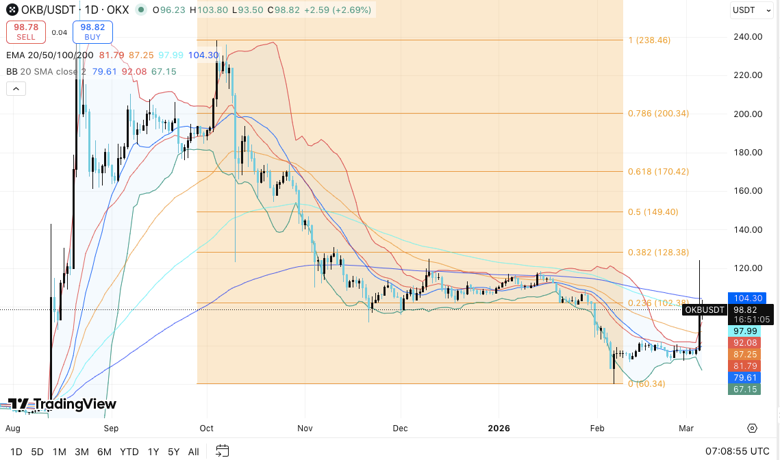 The technical picture shows OKB consolidating after its February bottom near $60. Price has reclaimed the EMA20 and EMA50, but still faces a larger downtrend. A decisive move above $105–$108 could trigger stronger momentum and higher volatility. Conversely, failure to defend $92 risks a pullback toward $87 and the longer-term support near $81.