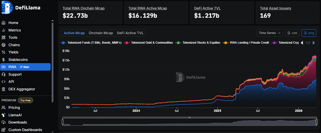 According to DeFiLlama data, the total tokenized RWA value excluding stablecoins is $22.73B as of March 21, 2026.