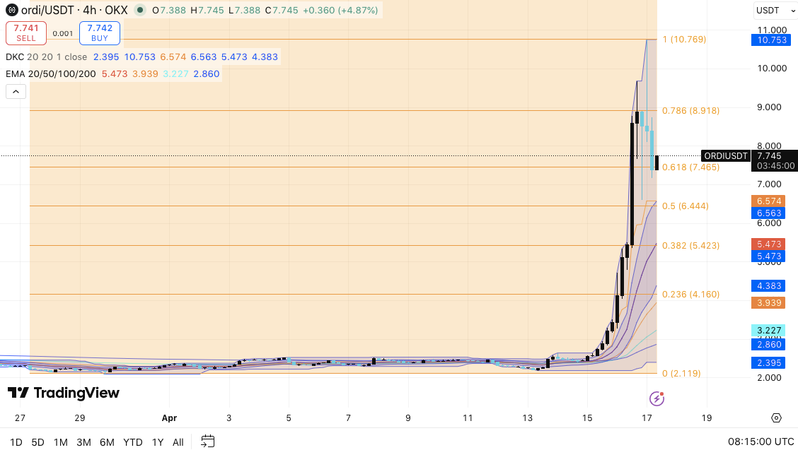 ORDI climbed rapidly from near $2 to a peak above $10.7, forming a parabolic advance. Such moves rarely sustain without retracement.