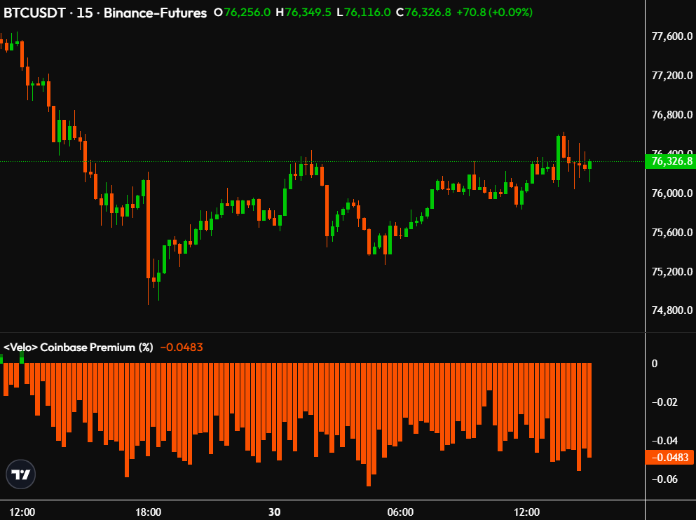 - Bitcoin consolidates near $76K, with weakness in Coinbase Premium signaling cautious institutional participation.