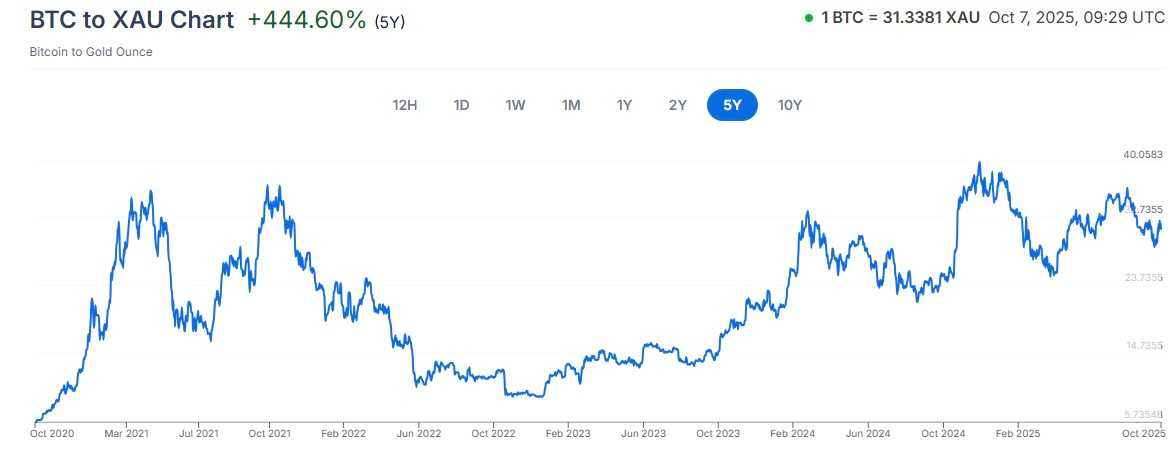 Schiff said Bitcoin ( BTC ) must surpass its record high priced in gold before calling it a bull market. Based on current gold prices near $4,000 per ounce, he estimated that BTC would need to reach about $148,000 to match its previous peak in gold terms; roughly 15% below its record. At the time of writing, 1 BTC exchanged for 31.33 gold ounces, down from its December 2024 high of 40 ounces.