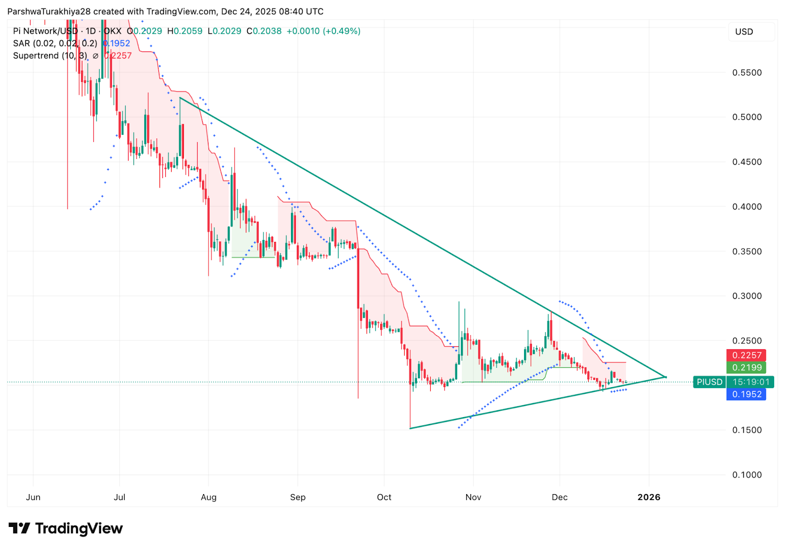 Pi price today trades near $0.204, holding just above a critical short-term support zone as price compresses into the apex of a descending wedge. The structure reflects a market at decision point. Sellers continue to control the broader trend, but downside momentum has slowed as buyers repeatedly defend the $0.195 to $0.200 area.