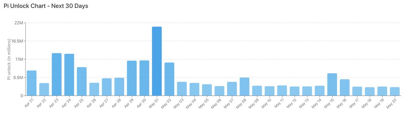 Daily unlocks average close to 5.9 million PI, adding steady liquidity into the market. Moreover, a peak unlock of over 20 million PI is expected on May 1. This spike could increase short-term volatility.