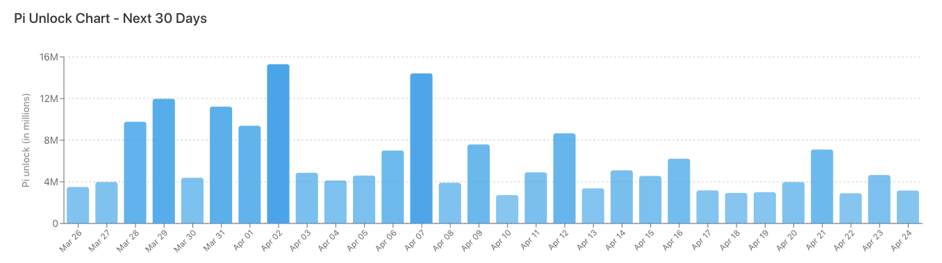 Over the next 30 days, approximately 182 million Pi will unlock. This accounts for just over three percent of locked supply. On average, more than 6 million Pi will enter circulation daily.