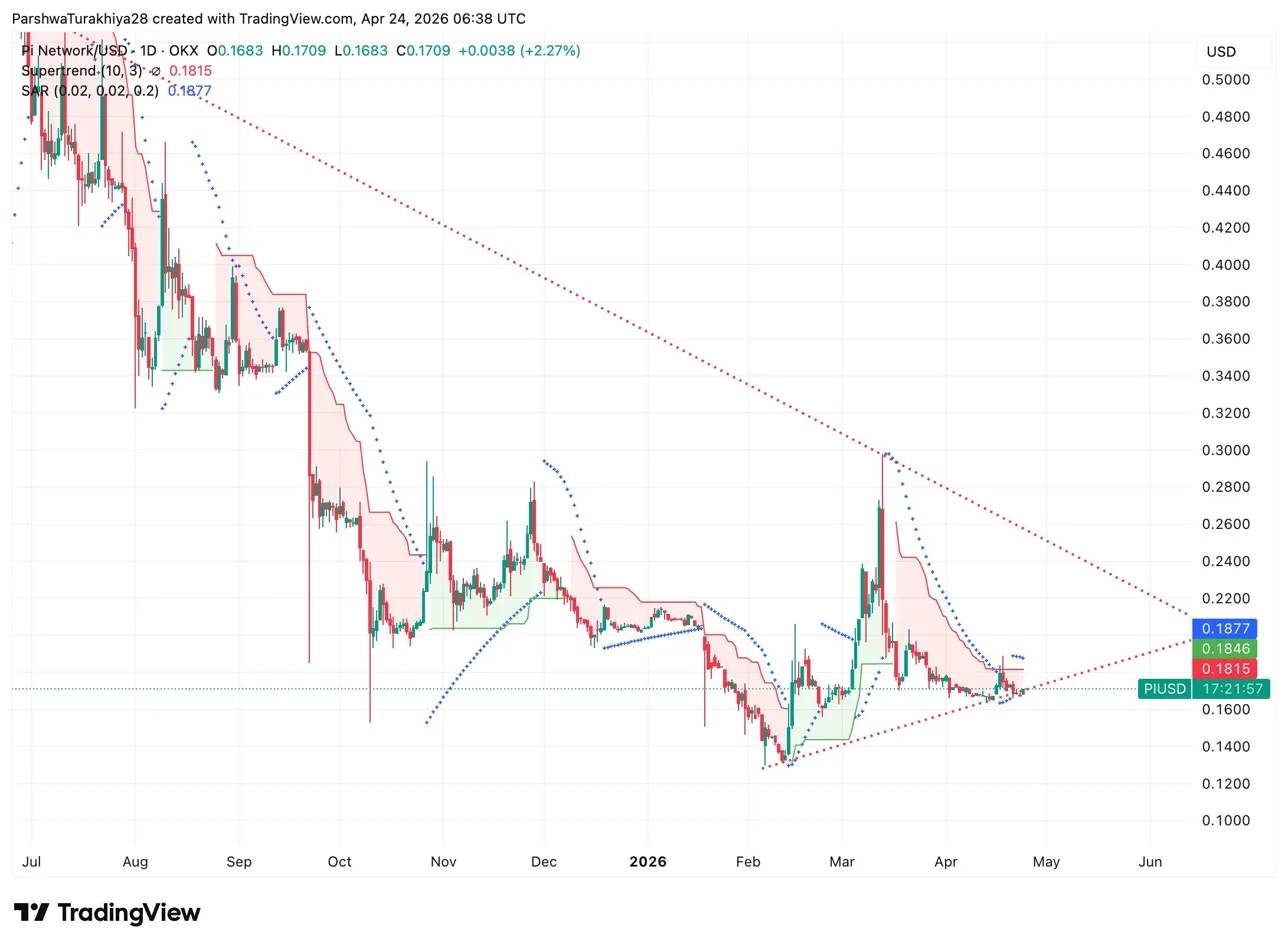 - PI trades at $0.1709, up 2.27%, with Supertrend at $0.1815 and SAR at $0.1877 capping every rally since March.