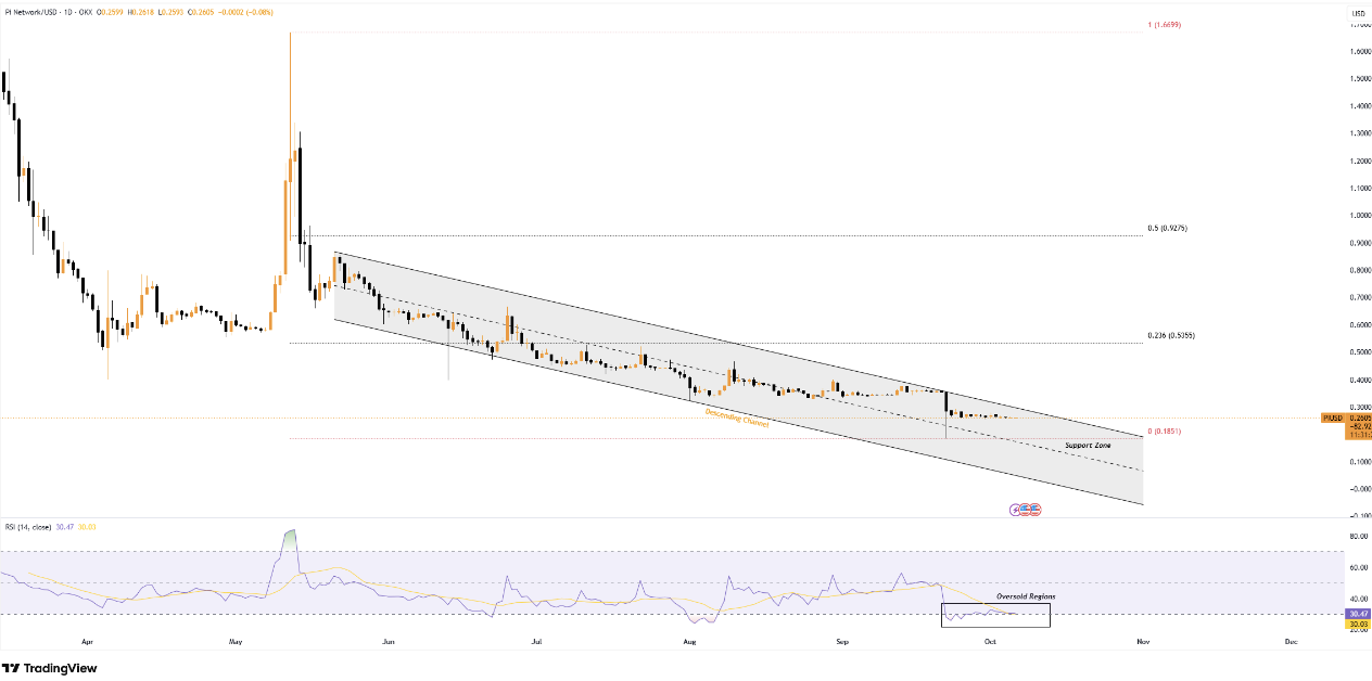 - Technical picture: PI continues to trend within a descending channel since April, reflecting sustained selling pressure and weak buyer participation. The RSI near 30 highlights oversold conditions, but recovery attempts have repeatedly stalled below $0.30.
