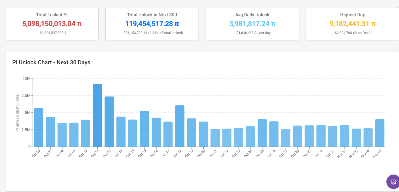 In the next 30 days, approximately 119.4 million PI tokens, worth over $31 million, will unlock according to PiScan data. The daily unlock average stands near 3.98 million PI, with the largest event of 9.18 million PI expected on October 11.