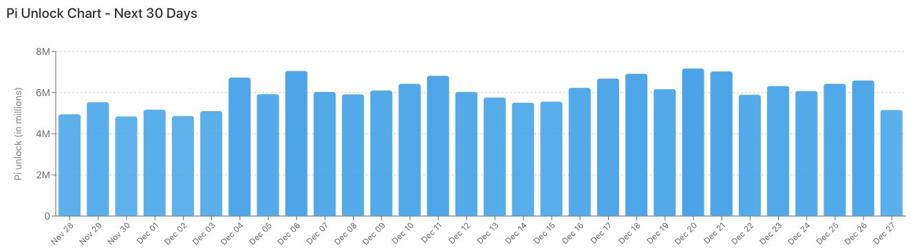 Pi Network’s latest unlocking data shows over 5 billion locked Pi, valued at about $1.28 billion. Moreover, the next 30 days include more than 180 million Pi scheduled for release. This volume equals roughly 3.6% of locked supply. The average daily unlock sits near 6 million Pi, worth about $1.54 million. The highest unlock day reaches more than 7.1 million Pi.