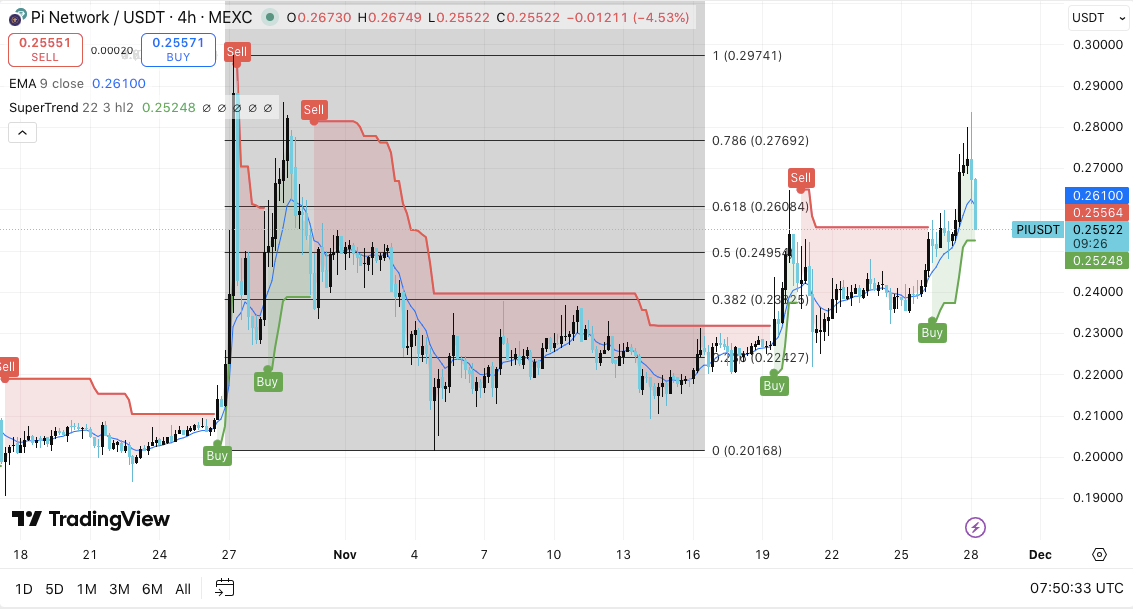 Pi is retracing after reaching the $0.27 zone, and traders are watching how the price reacts as it moves closer to key Fibonacci regions that shaped last week’s rally. The recent rejection near the 0.786 level sparked short-term profit-taking.