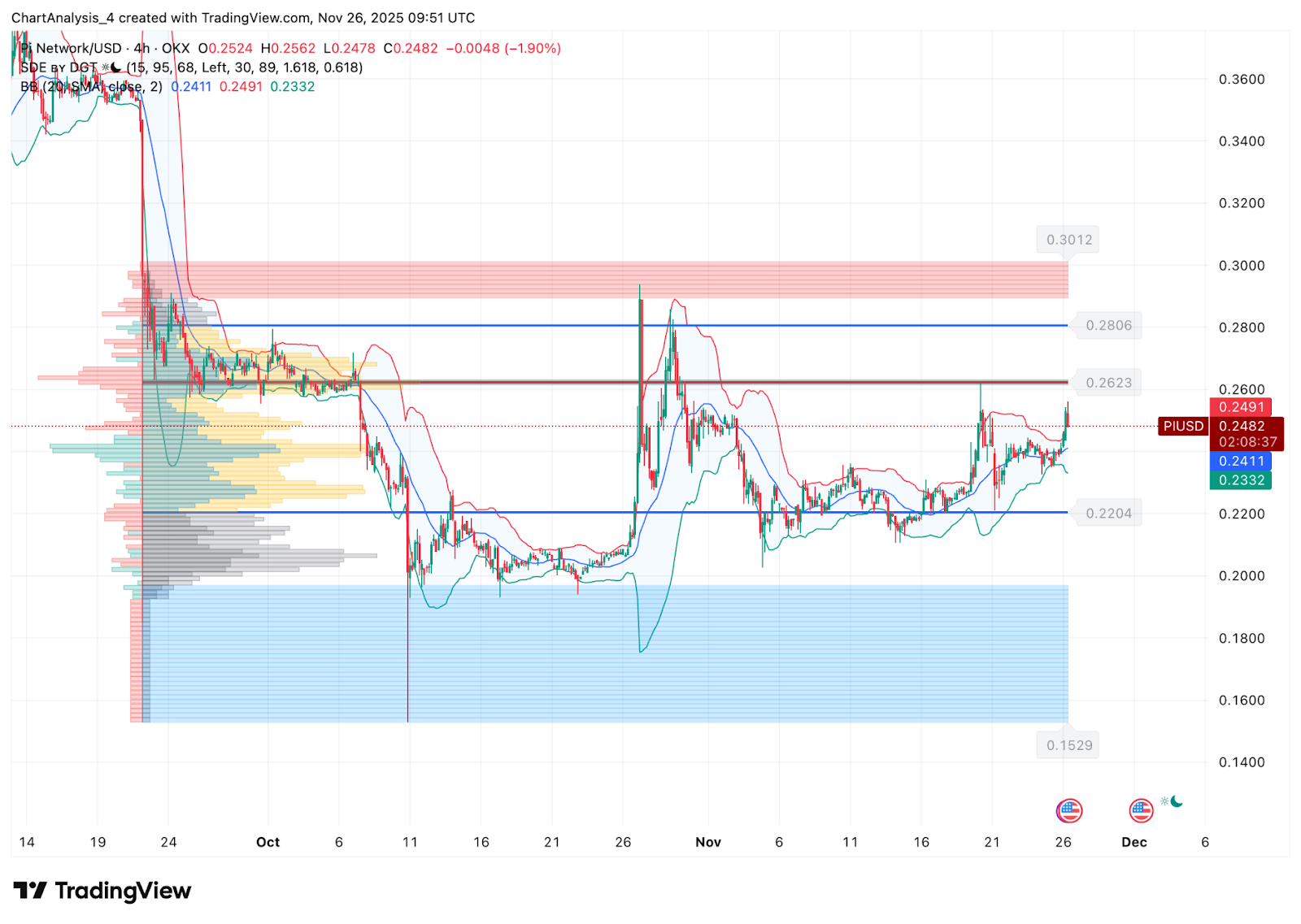 A push above $0.262 would open the door to $0.280, and a breakout there targets $0.301. A rejection instead sends Pi back toward $0.220, and losing that level exposes a deeper retracement toward $0.152.