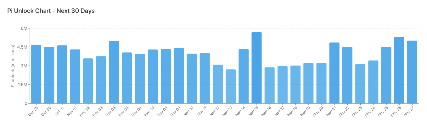 In the coming weeks, Pi Network is expected to unlock about 121.5 million tokens roughly 2.39% of its locked supply. According to Piscan data, the project still holds around 5.07 billion Pi in locked circulation, valued at nearly $1.35 billion. Consequently, the largest daily unlock, scheduled for November 15, could release over 5.7 million Pi worth more than $1.5 million.