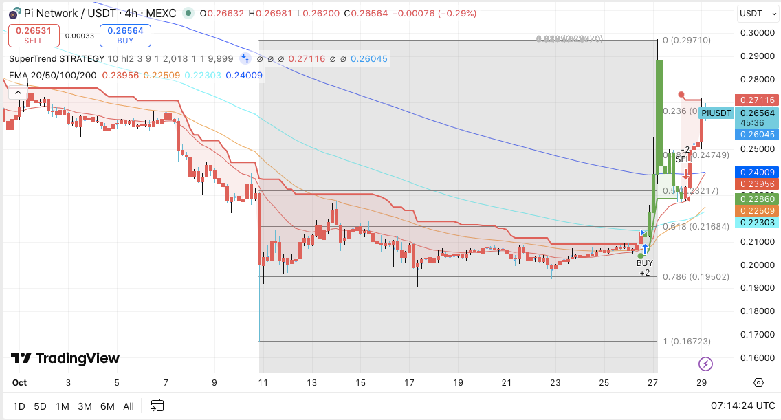 Pi’s latest chart pattern suggests a brief consolidation before another potential upside move. The $0.262 level, aligned with the 0.236 Fibonacci retracement, currently acts as short-term support.