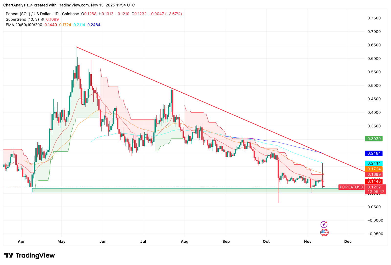 The daily chart shows Popcat consolidating inside a wide demand range between $0.12 and $0.11, an area that has repeatedly provided short-term support over the past three months. However, the price remains locked under a long-term descending resistance line connecting lower highs from the $0.75 peak in April.