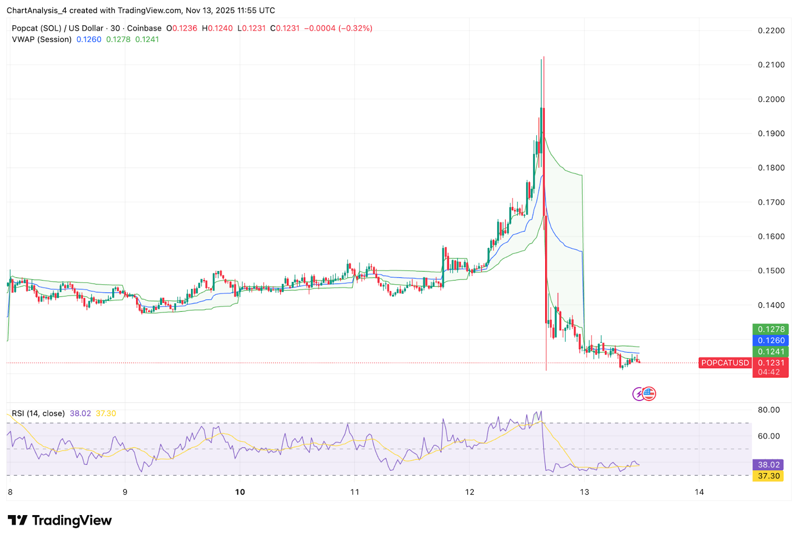 On the 30-minute chart, Popcat trades below the VWAP at $0.126, signaling continued intraday weakness. The short-term band between $0.122 and $0.126 remains the active consolidation zone after last week’s volatile spike toward $0.20 was quickly sold down.