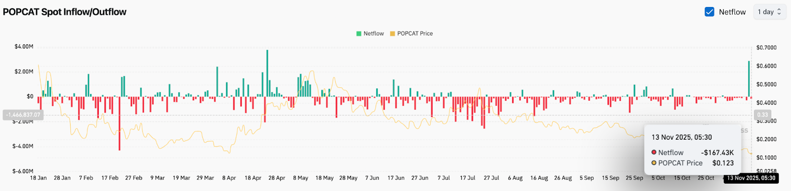 Spot flow data from Coinglass shows $167,000 in net outflows on November 13, extending a series of small but persistent withdrawals. Over recent weeks, Popcat’s flow structure has reflected rotation away from spot holdings rather than accumulation, aligning with the lack of demand seen on the charts.