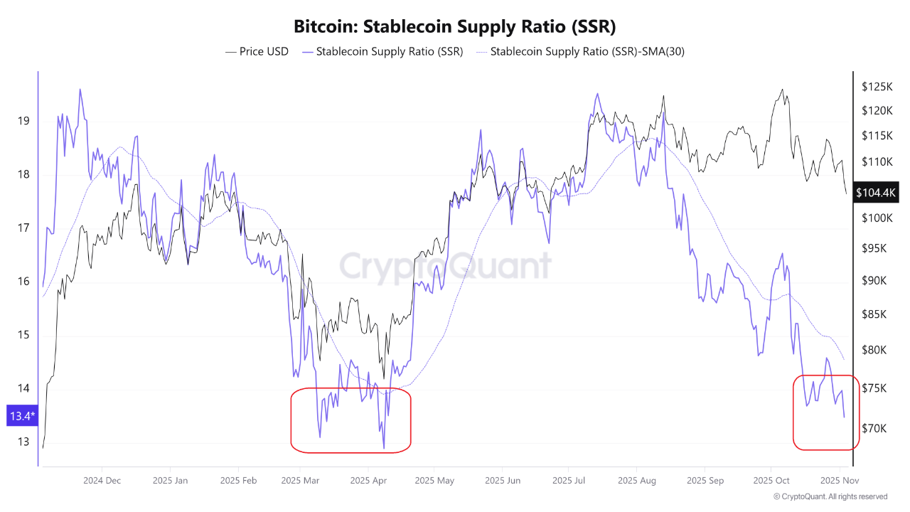 Enquanto isso, a plataforma de análise on-chain CryptoQuant observou que a taxa de fornecimento de stablecoin (SSR) do Bitcoin caiu para a faixa de 13 a 14, marcando historicamente uma zona de recuperação. O baixo SSR indica que a liquidez da stablecoin, ou poder de compra marginalizado, está aumentando, indicando que o capital pode em breve reentrar no mercado.