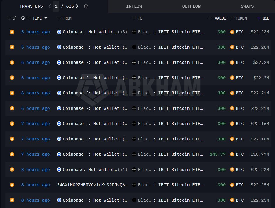 As últimas transferências fazem parte de uma onda de compras mais geral. Dados da Arkham mostram que a BlackRock comprou US$ 505,7 milhões em BTC nas últimas 48 horas.