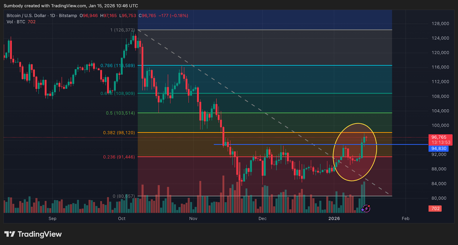 A última recuada, acumulação e recuperação ocorreram em torno de um nível crucial de Fibonacci, quebrando acima, o que indica força notável na atual alta. No entanto, o Bitcoin enfrenta níveis de resistência mais significativos, incluindo outra resistência de Fibonacci e o marco psicológico de $100.000. Os dados da TradingView revelam que o BTC estava negociado por $96.765 no momento da redação, após testar a resistência de 0,382 Fibonacci em $98.120.