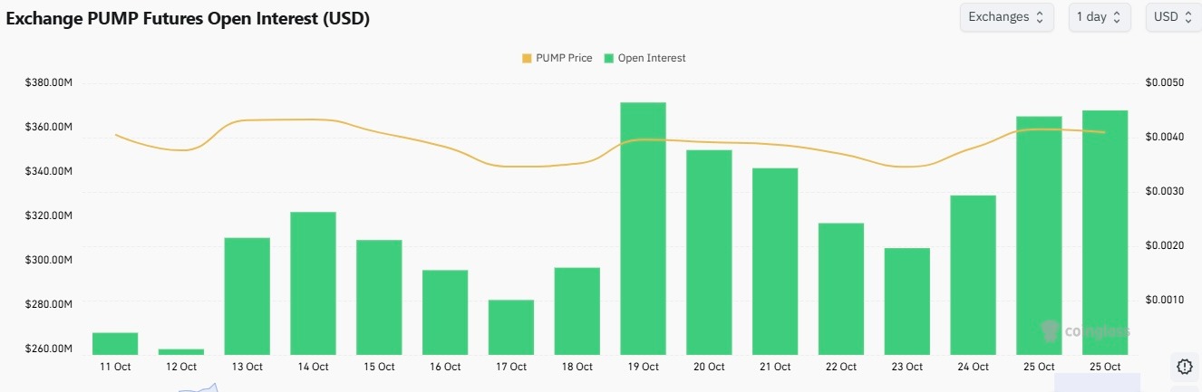 De acordo com a análise de dados de mercado agregados da CoinGlass, os contratos em aberto de futuros (OI) do PUMP aumentaram gradualmente nos últimos dias. Desde o crash das criptomoedas em outubro, o OI da PUMP subiu de US$ 267 milhões para cerca de US$ 367 milhões no momento desta publicação.