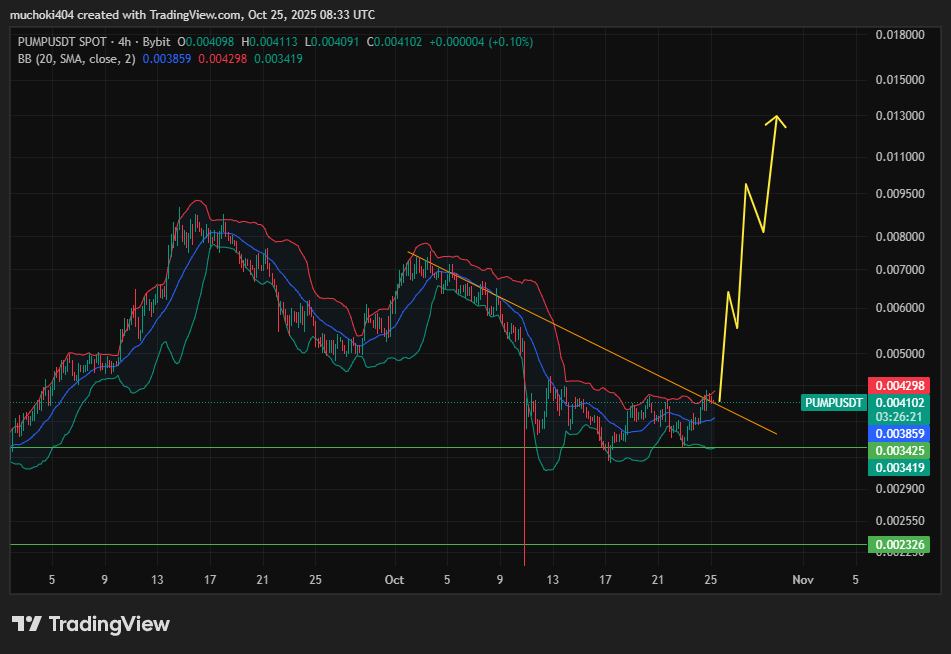 Enquanto o sentimento cripto mais amplo permanece temeroso (Fear & Greed Index 34), o PUMP mostrou força relativa, saltando 23% de suas mínimas recentes perto de US$ 0,0034 para ser negociado em torno de US$ 0,0041.