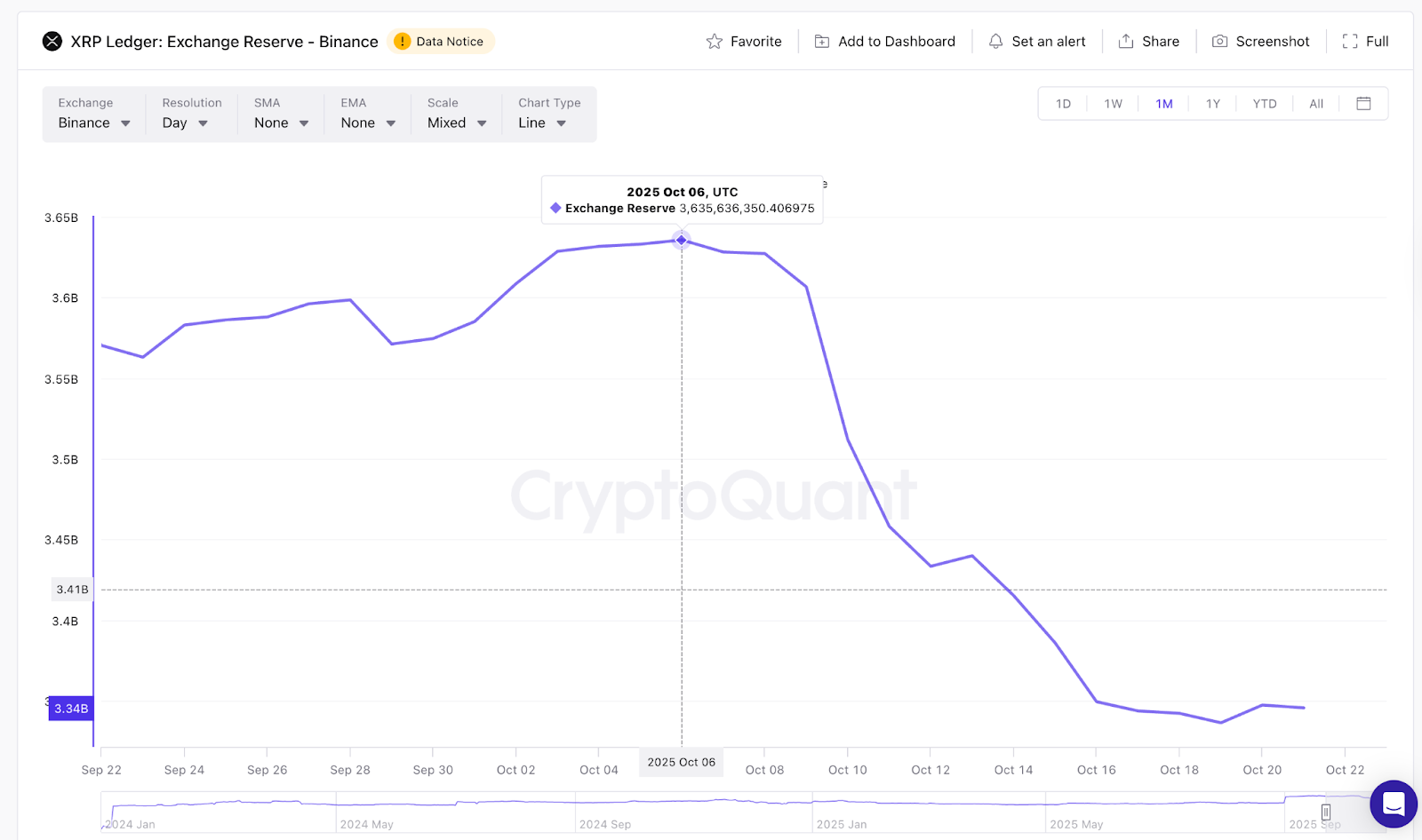 Em outubro, o XRP na exchange Binance caiu de 3,6 bilhões para o nível atual de 3,3 bilhões, fortalecendo a narrativa de “choque de oferta”. Isso sugere que o encolhimento dos saldos das exchanges pode restringir a oferta e aumentar o preço do XRP em um futuro próximo.