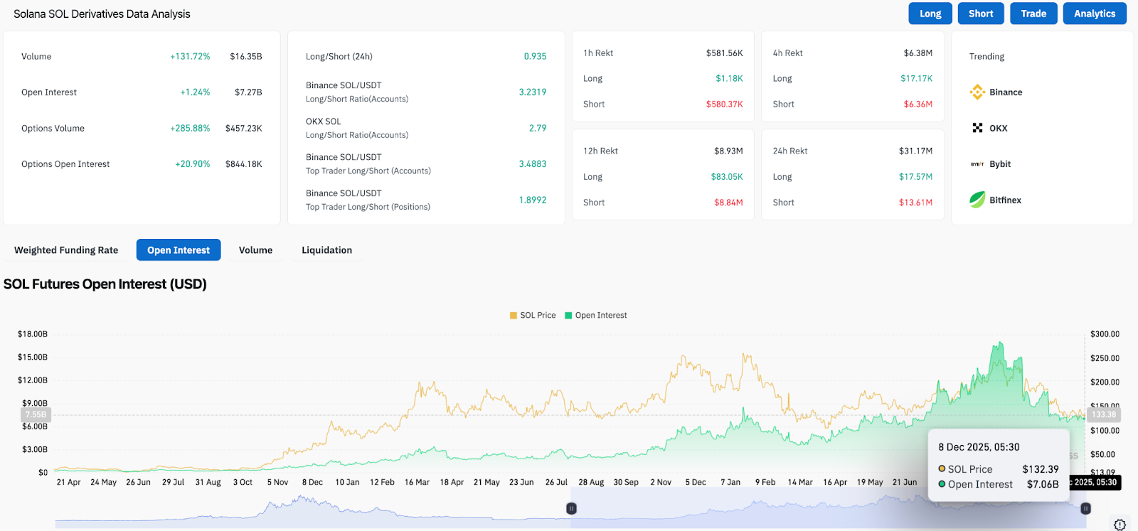 Os dados de derivativos mostram uma mudança clara no posicionamento. O interesse aberto dos futuros da Solana subiu 1,24%, para US$ 7,27 bilhões, enquanto o volume subiu 131,72%, para US$ 16,35 bilhões, confirmando que os traders alavancados estão ativos novamente. Os mercados de opções também tiveram aumentos acentuados, com o volume de opções subindo 285,88% e o juro aberto das opções subindo 20,90%.
