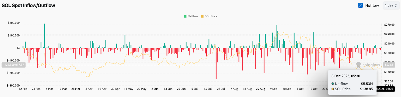 Os fluxos spot tornaram-se positivos, embora a magnitude permaneça modesta. Solana registrou aproximadamente US$ 5,53 milhões em entradas líquidas em 8 de dezembro, revertendo uma semana de impressões majoritariamente negativas.