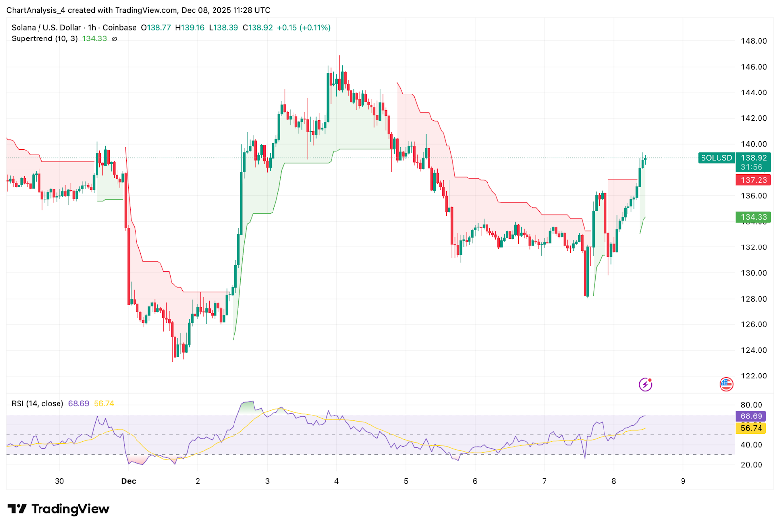 No gráfico de 1 hora, Solana recuperou a zona de inversão Supertrend em $134,33, transformando-a em suporte de curto prazo. A recente alta empurrou o preço para a faixa de $139 com as velas acelerando, e o RSI atingiu brevemente níveis de supercompra, mostrando momentum em vez de deriva.