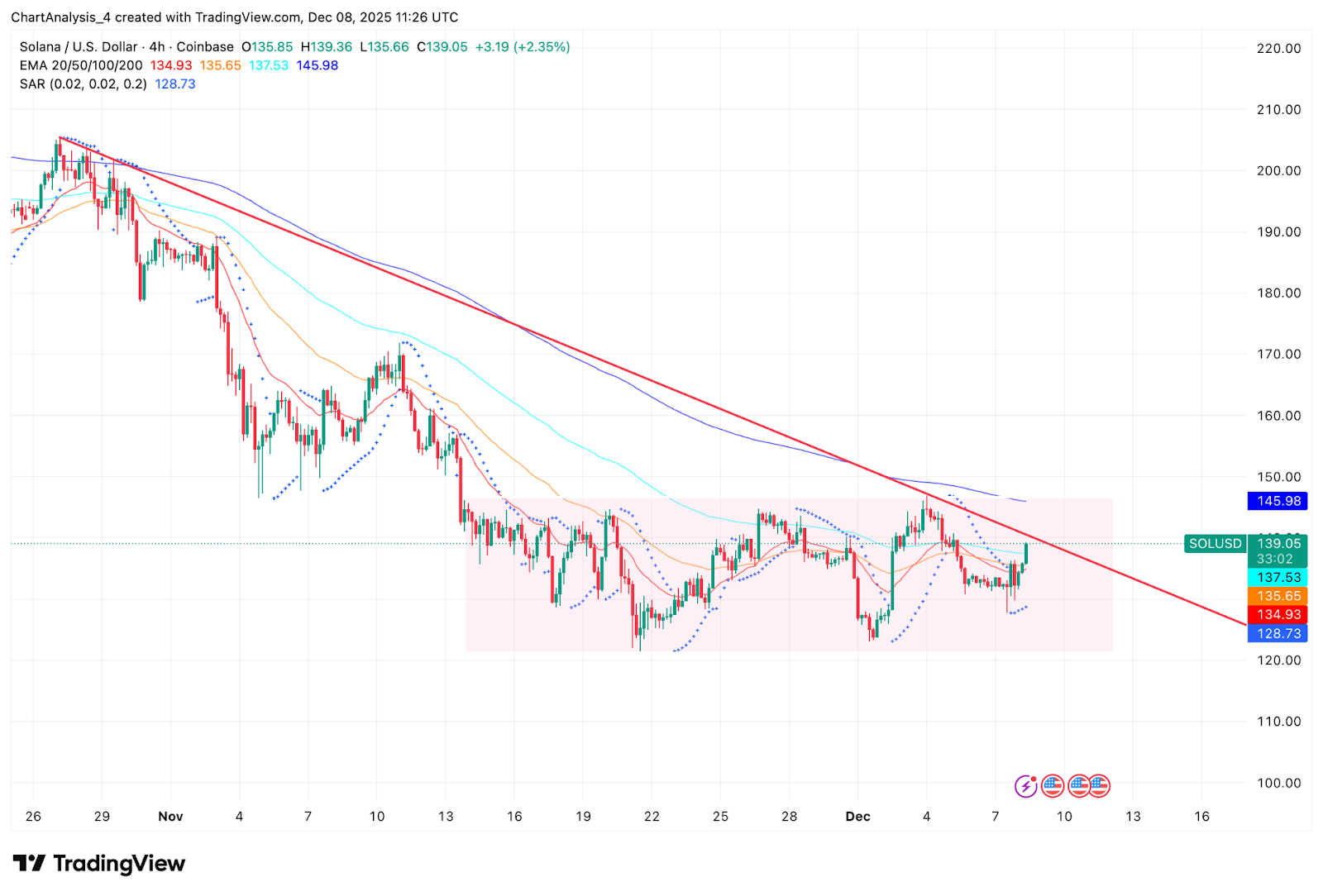 No gráfico de 4 horas, Solana está pressionando contra a tendência de queda próxima a $140, uma barreira que rejeitou todas as tentativas de alta desde outubro. O movimento atual representa o terceiro reteste dessa linha nas últimas duas semanas, mostrando interesse constante de compra, mas também oferta consistente em níveis mais altos.