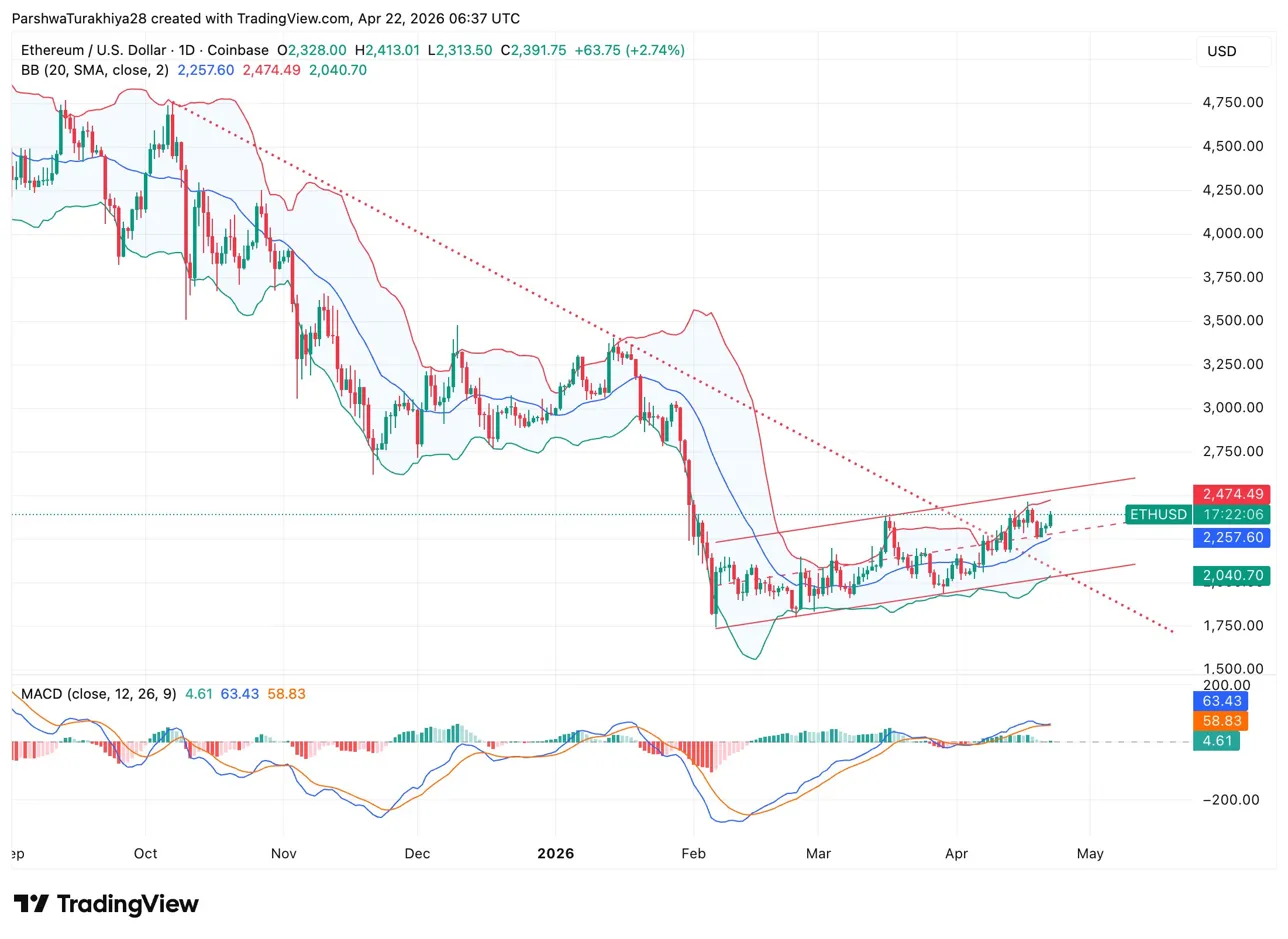 O ETH negocia a $2.391 em 22 de abril, alta de 2,74%, pressionando a faixa superior de Bollinger em $2.474, enquanto o MACD volta positivo pela primeira vez desde fevereiro, entradas de ETFs atingem o nono dia consecutivo, e a Etherealize publica uma meta de preço de longo prazo de $250.000 chamando o ETH de melhor dinheiro que o Bitcoin.
