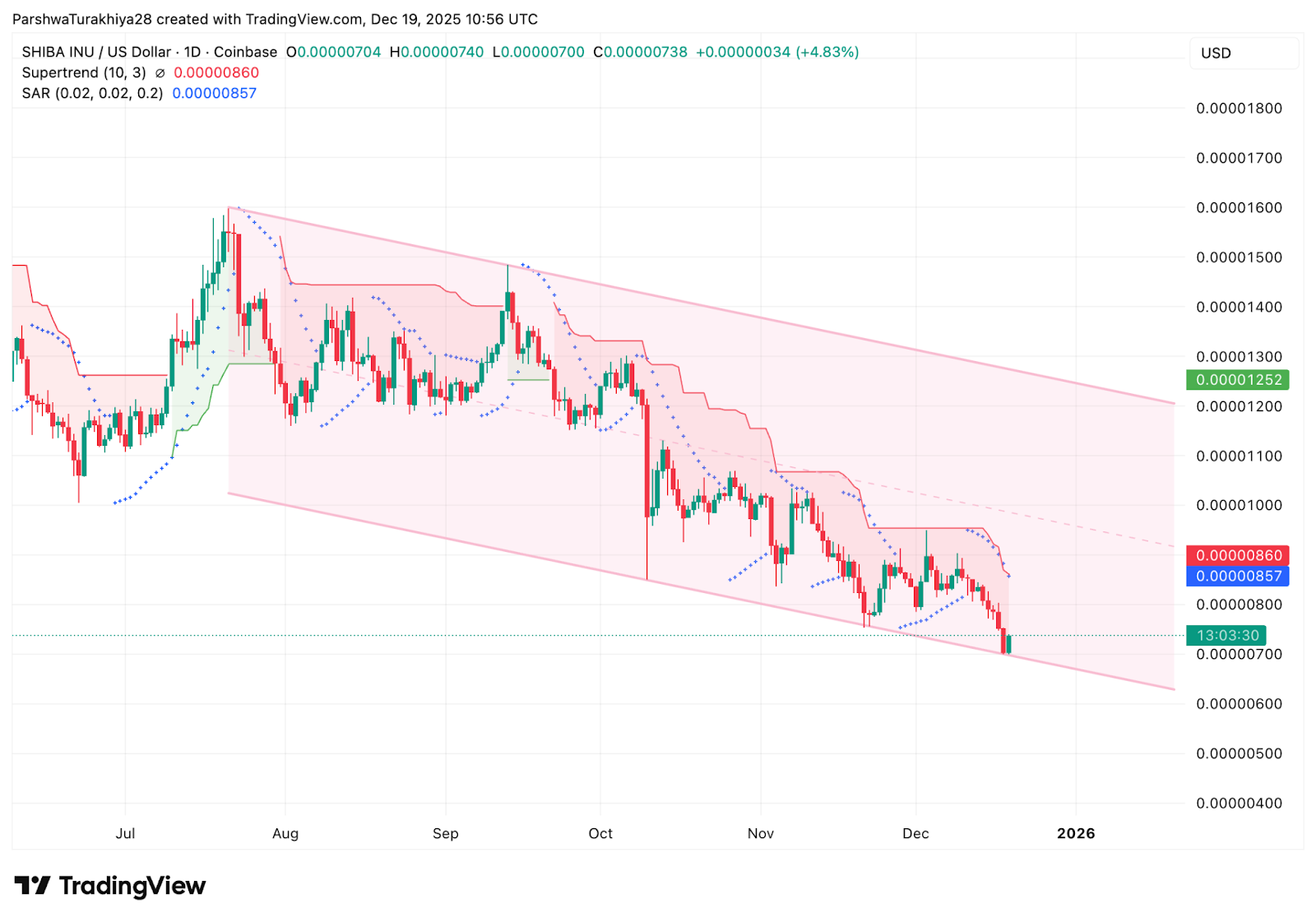 Por enquanto, a recuperação do Shiba Inu permanece como uma pausa técnica dentro de uma estrutura baixista, com Supertrend e SAR ainda favorecendo firmemente os vendedores.