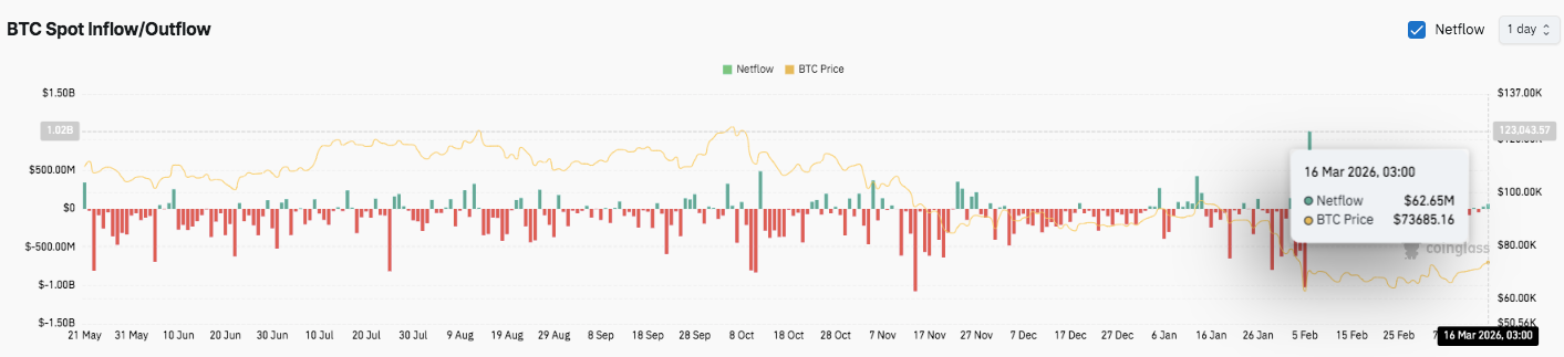Além disso, fevereiro registrou um dos maiores clusters de saída durante uma forte queda de preços. Esse padrão sugere que os investidores encararam a queda como uma oportunidade de compra. Pequenos fluxos retornaram recentemente em março. No entanto, a tendência mais ampla ainda favorece a acumulação em vez da distribuição.