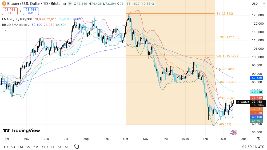 Por outro lado, o Bitcoin enfrenta várias barreiras antes que uma reversão total de tendência possa se desenvolver. A primeira resistência aparece entre $75.000 e $76.000. Essa área está alinhada com o nível de retracement de Fibonacci 0,236.