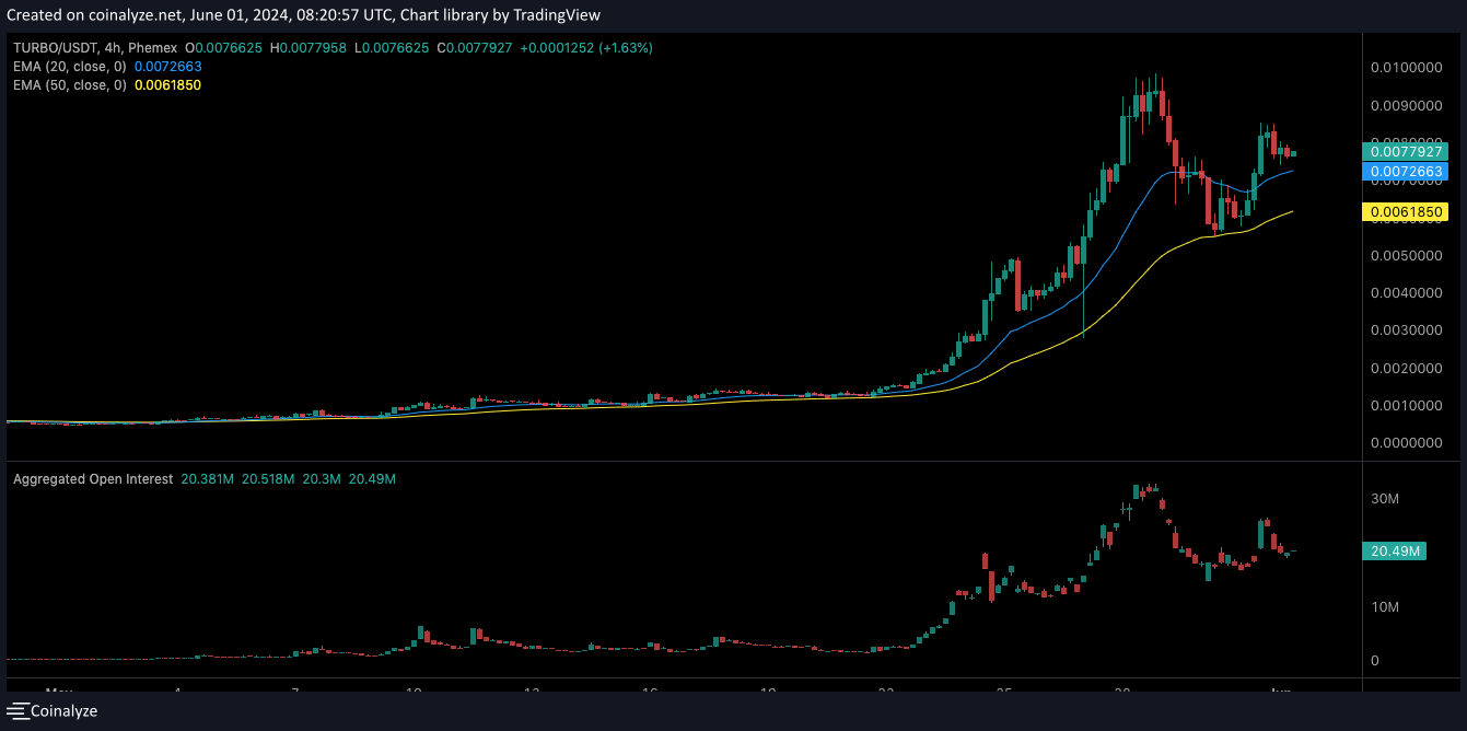 - Os traders estavam tirando lucros do TURBO, sugerindo uma queda para US$ 0,0087.